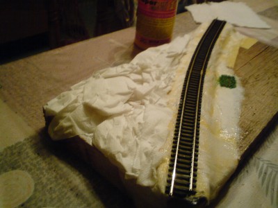 Když už bylo zacpáno, tak jsem si to celé pokryl zeleným krepovým papírem. Pokrejvám to z toho důvodu, protože když někde bude chybět malinko travičky, tak na bílým podkladě to bude vidět, zato na takovýmto podkladě ne ;)