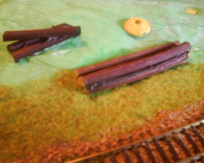 a je to tu... některé stromy byly s podstavem, ale některé byly na vysokých kmenech. Proto jsem ty s vysokými kmeny zkrátil a ty kmeny posléze použil jako výplň, tedy klády srovnané na kupě. Prot uřízlé stromky jsem potom udělal podstavce z modelíny a přilepil na dioramu.
